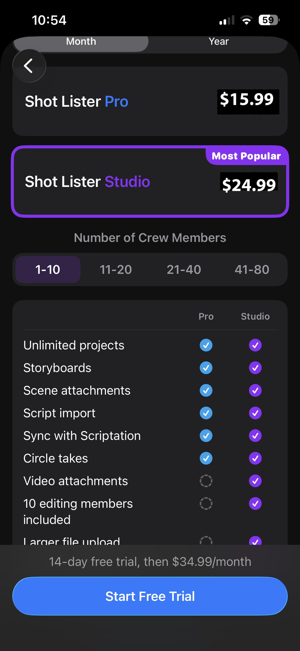 Our Studio Plan introduces a single charge instead of the inefficiency of managing multiple Pro subscriptions for key crew members. And don’t worry, with our Studio Plan, you can upgrade or downgrade as crew size changes. If the Studio Plan owner downgrades, the new plan won't go into effect until the next subscription "renewal" date.